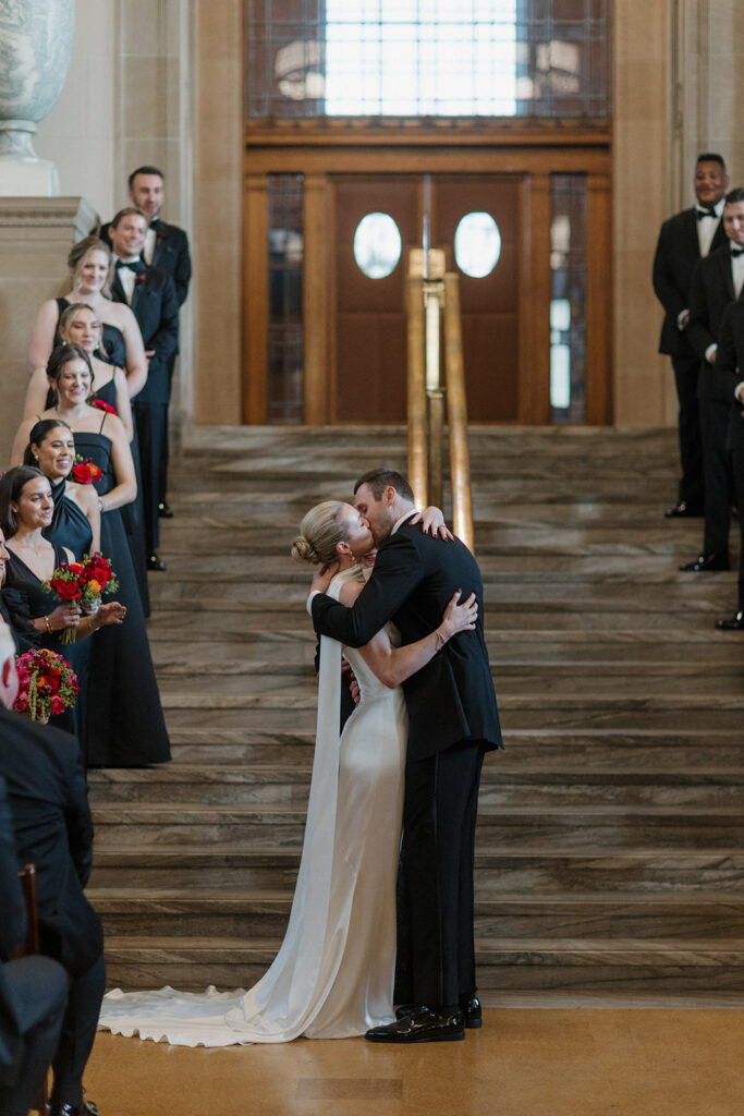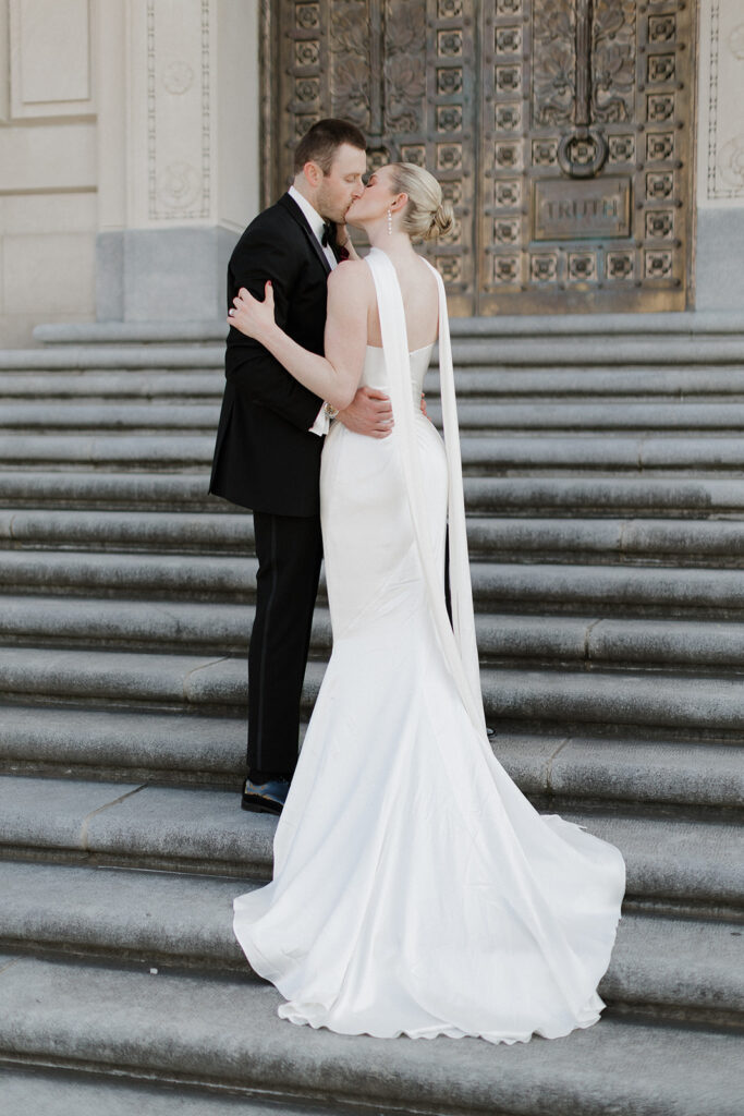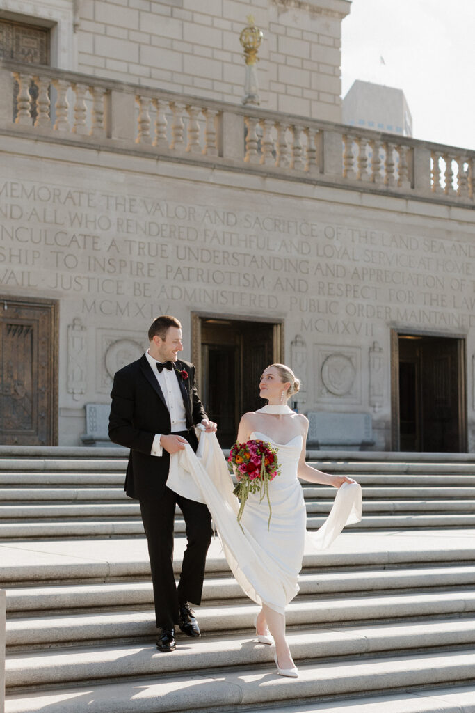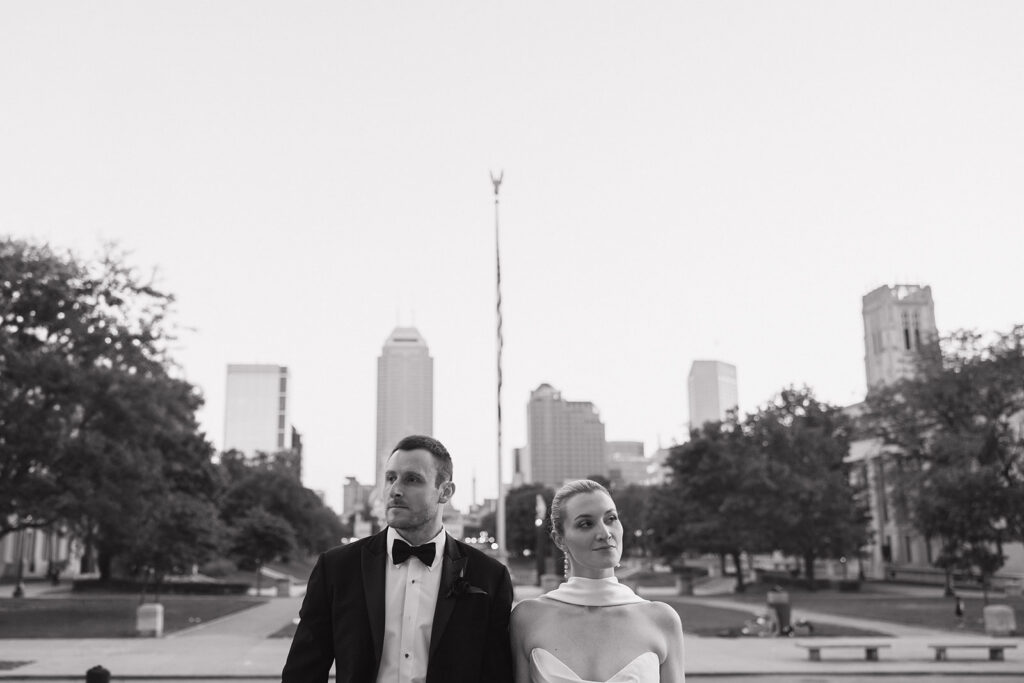 Before heading to the ceremony, we stopped at the Indiana World War Memorial for wedding party portraits. This is arguably one of the best spots for photography in the city. The massive stone columns and grand staircases provided a timeless, architectural scale that made the entire wedding party look like they stepped out of a high-fashion magazine.